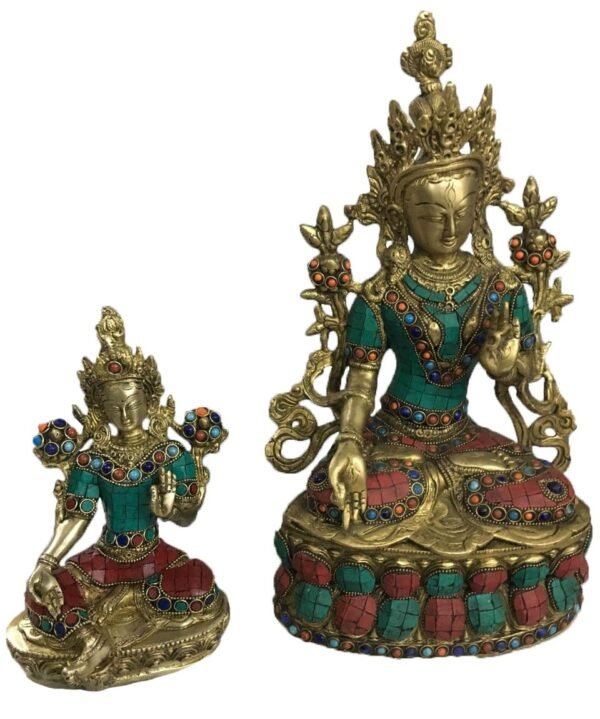 Colorful Brass Turquoise Tara Buddha Figurine – Brass Handmade Sculpture – Buddhism Religious Home Decor